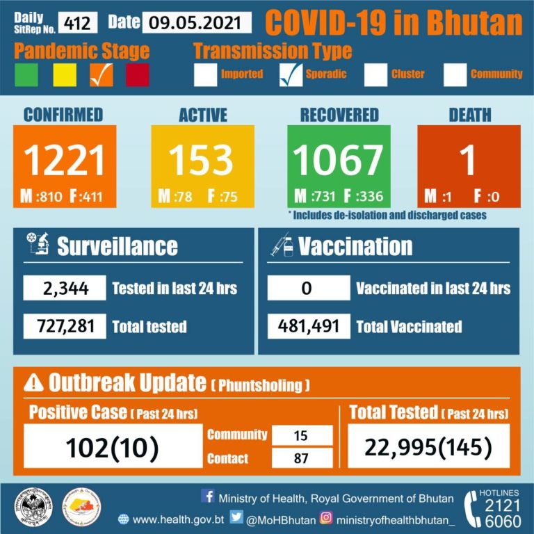 Thimphu: 2 Community (High risk to low-risk travelers detected from Quarantine Facility) Samtse (Gomtu): 5 Contact